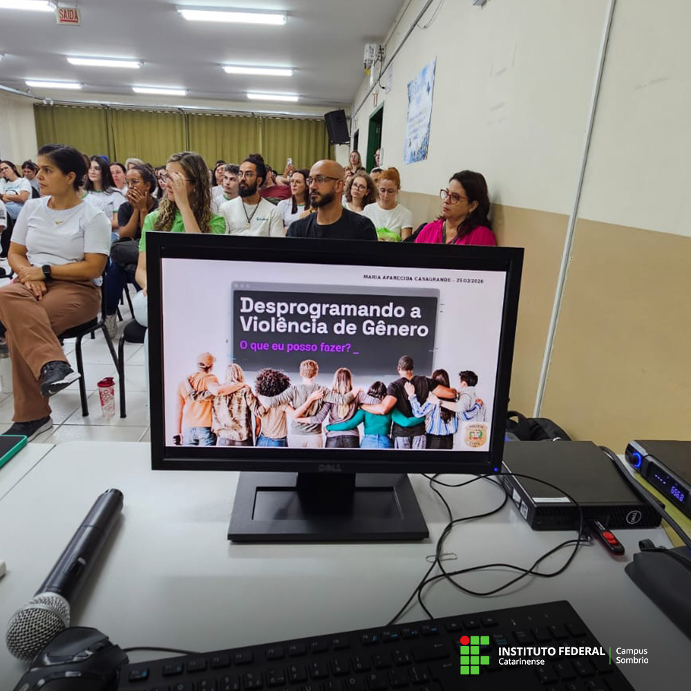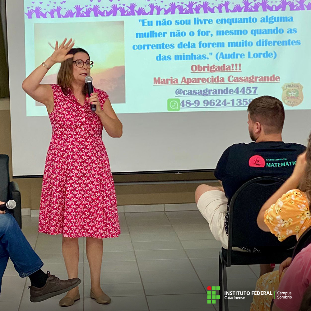 Ontem, dia 25/03, o IFC Campus Sombrio recebeu a Dra. Maria Aparecida Casagrande, professora da Academia da Polícia Civil do Estado de Santa Catarina (ACADEPOL), para a palestra “Desprogramando a violência de gênero: o que eu posso fazer?”.