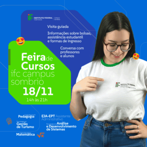 O Instituto Federal Catarinense (IFC) – Campus Sombrio promove, no dia 18 de novembro de 2025, o evento “Um Dia no IFC Campus Sombrio”, que acontece das 14h às 21h. A ação tem como objetivo aproximar a instituição da comunidade, apresentando seus cursos noturnos e de qualificação profissional, além de incentivar a continuidade dos estudos e valorizar a educação pública, gratuita e de qualidade.