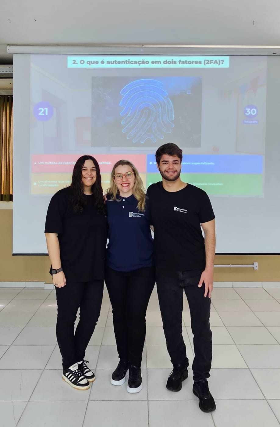 ㅤㅤㅤㅤㅤㅤㅤLegenda: Os autores da pesquisa, a estudante Juliana Marques da Silva, a professora Ana Paula Bourscheid e o egresso Samuel Severino Paulo Figueredo, com a imagem do protótipo de quiz interativo sobre segurança e proteção de dados na internet ao fundo.